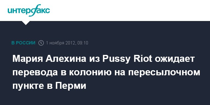 Пермь. 1 ноября. INTERFAX.RU - Осужденная участница панк-группы Pussy Riot Мария Алехина в настоящее время находится на транзитно-пересылочном пункте в Перми, сообщил представитель Пермского регионального правозащитного центра.