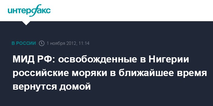 Москва. 1 ноября. INTERFAX.RU- Российские моряки, захваченные в Нигерии, освобождены и чувствуют себя хорошо.