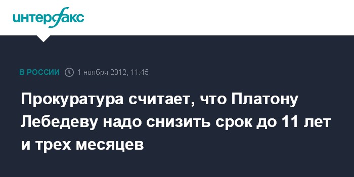 Вельск (Архангельская область). 1 ноября. INTERFAX.RU - Прокуратура согласна с необходимостью снизить срок заключения бывшему руководителю МФО "МЕНАТЕП" Платону Лебедеву лишь до 11 лет и трех месяцев. Об этом представитель ведомства Сергей Семенов заявил на заседании Вельского городского суда Архангельской области, где рассматривается требование защиты Лебедева о снижении ему срока заключения.