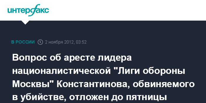 Вопрос об аресте лидера националистической "Лиги обороны Москвы" Константинова, обвиняемого в убийстве, отложен до пятницы