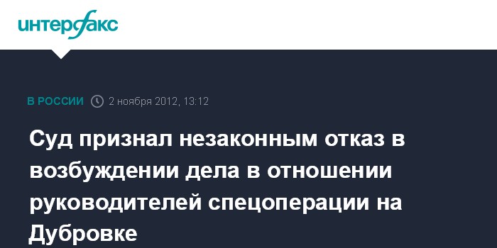 Москва. 2 ноября. INTERFAX.RU - Лефортовский суд Москвы признал незаконным отказ следователей возбудить уголовное дело в отношении должностных лиц, руководивших операцией по освобождению заложников в театральном центре на Дубровке в 2002 году.