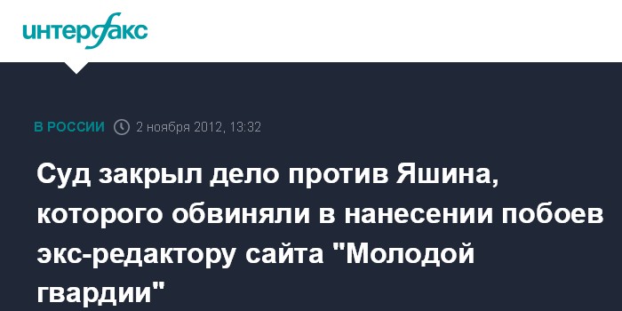 Москва. 2 ноября. INTERFAX.RU - Мировой суд Измайловского района Москвы прекратил уголовное дело в отношении оппозиционера Ильи Яшина, который обвинялся в нанесении побоев бывшему заместителю главного редактора сайта "Молодой гвардии" Владиславу Калашнику.