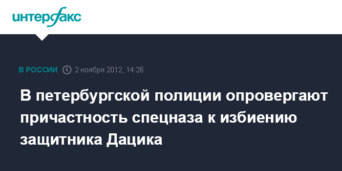 По данным полиции, 26 октября 2012 года в УМВД России по Невскому району Санкт-Петербурга из медицинского учреждения поступила телефонограмма о причинении телесных повреждений общественному защитнику Дацика. Данное сообщение в установленном порядке зарегистрировано и направлено для принятия процессуального решения в следственные органы.