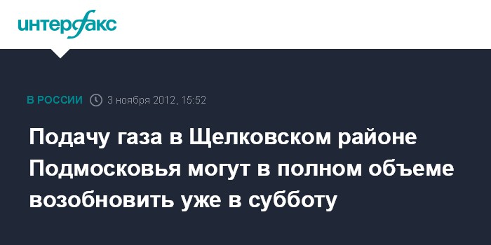Москва. 3 ноября. INTERFAX.RU - Власти Подмосковья обещают в течение субботы восстановить поврежденный газопровод и обеспечить подачу газа в Щелковском районе.