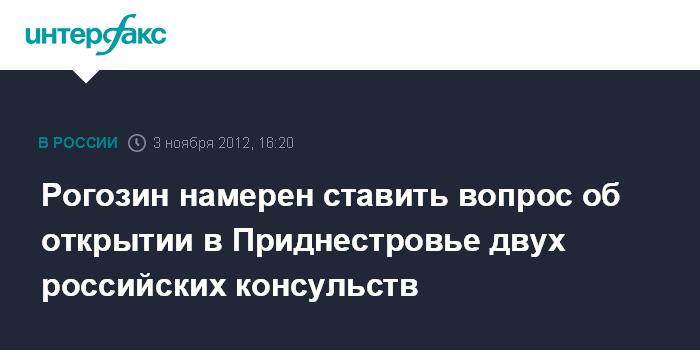 Климовск (Московская область). 3 ноября. INTERFAX.RU - Вопрос создания двух российских консульств в непризнанной Приднестровской Молдавской республике станет главной целью поездки вице-премьера РФ Дмитрия Рогозина в Молдавию в середине ноября.