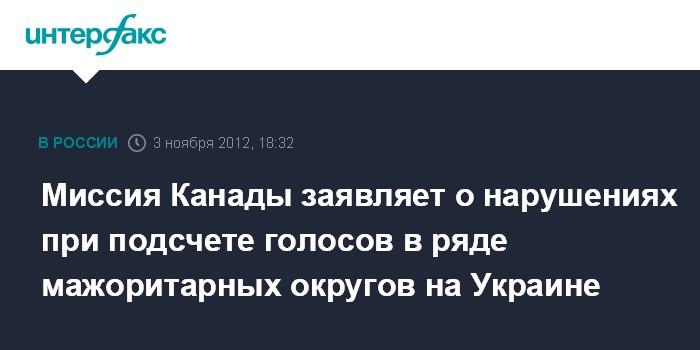 Киев. 3 ноября. INTERFAX.RU - Миссия наблюдателей Канады обращает внимание на серьезные нарушения во время подсчета голосов после парламентских выборов на Украине по мажоритарной составляющей, что вызывает сомнения относительно достоверности результатов в ряде округов.