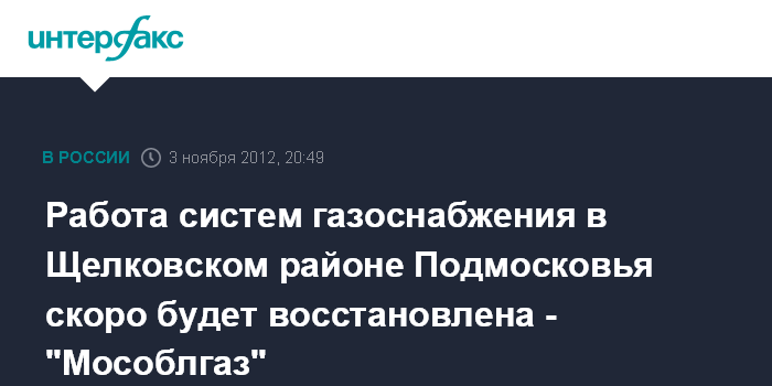 Москва. 3 ноября. INTERFAX.RU - "Мособлгаз" обещает восстановить газоснабжение Щелковского района в ближайшее время.