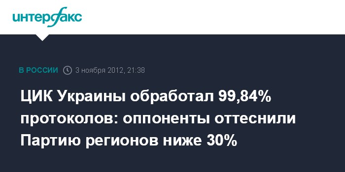 Киев. 3 ноября. ИНТЕРФАКС-УКРАИНА - Согласно результатам 99,84% обработанных протоколов по многомандатному избирательному округу на парламентских выборах на Украине, Партия регионов набрала 29,99% голосов избирателей.