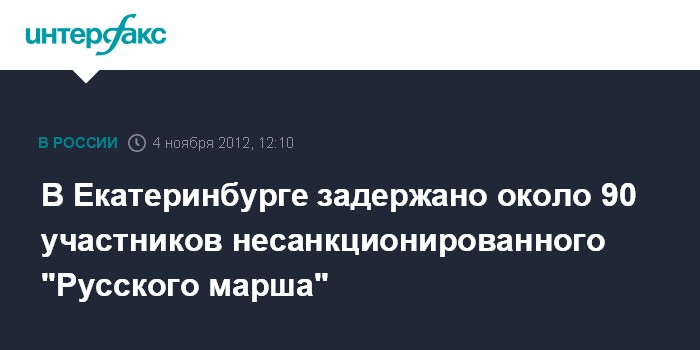 Екатеринбург. 4 ноября. INTERFAX.RU - Сотрудники полиции задержали порядка 90 человек, которые собрались в воскресенье днем на несанкционированный митинг на площади Кирова в Екатеринбурге в рамках "Русского марша".