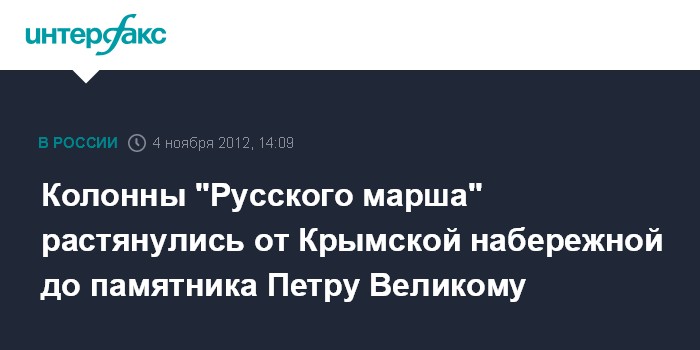 Как передает корреспондент "Интерфакса", колонна националистов растянулась от начала Крымской набережной до памятнику Петру Великому. При этом некоторые активисты уже дошли до площадки возле Центрального Дома художника, тогда как основная колонна пока не дошла.