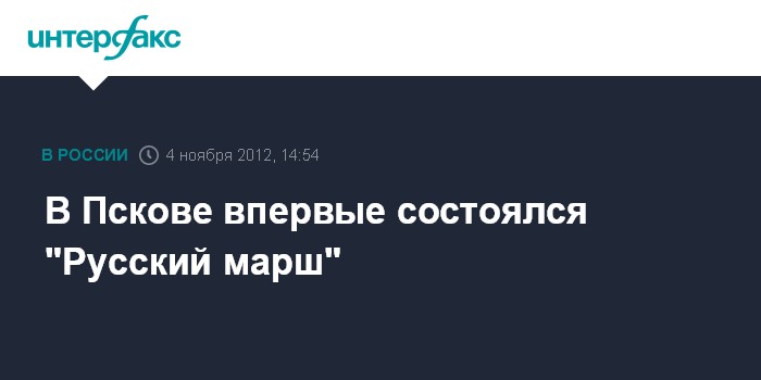 Псков. 4 ноября. INTERFAX.RU - В Пскове местные националисты вышли в воскресенье на свой первый "Русский марш". Как передал корреспондент "Интерфакса", около 100 человек прошествовали в полдень по одной из главных магистралей города - Рижскому проспекту - до площади Ленина, где прошел митинг.