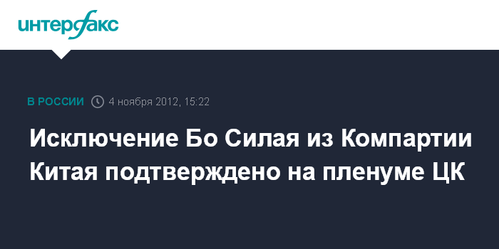 Пекин. 4 ноября. INTERFAX.RU - Центральный комитет Коммунистической партии Китая (КПК) на пленуме в Пекине подтвердил исключение из ее рядов Бо Силая, бывшего мэра китайского города Чунцина. Решение исключить Бо Силая из партии было принято политбюро КПК в сентябре. Он также был лишен депутатского иммунитета.