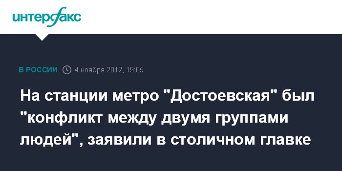 Как сообщили в воскресенье в пресс-службе ГУ МВД по Москве, "в результате проверки, проведенной сотрудниками столичного главка МВД, информация о массовой драке, якобы имевшей место в метро, не подтвердилась. Установлено, что на станции "Достоевская" произошел конфликт между двумя группами людей, двух человек с одной стороны и трех с другой. Конфликт перерос в потасовку, в результате которой один человек пострадал".