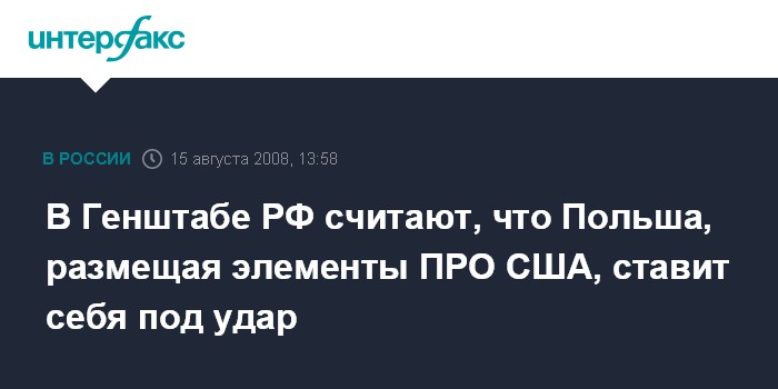 Москва. 15 августа. INTERFAX.RU - Польша, в случае размещения на своей территории элементов американской противоракетной обороны, становится объектом для удара противодействующих средств, заявил агентству "Интерфакс" заместитель начальника Генштаба Вооруженных сил РФ генерал-полковник Анатолий Ноговицын.
