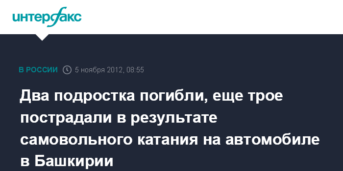 Уфа. 5 ноября. ИНТЕРФАКС-ПОВОЛЖЬЕ - Два девятиклассника погибли в Башкирии, еще двое их сверстников госпитализированы в результате ДТП на самовольно взятом покататься отцовском автомобиле, сообщили в пресс-службе ГИБДД по Башкирии в понедельник.