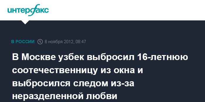 Москва. 6 октября. INTERFAX.RU - Молодой человек из Узбекистана в Москве убил свою несовершеннолетнюю землячку, выбросив ее из окна шестого этажа, а затем покончил с собой, выпрыгнув следом.