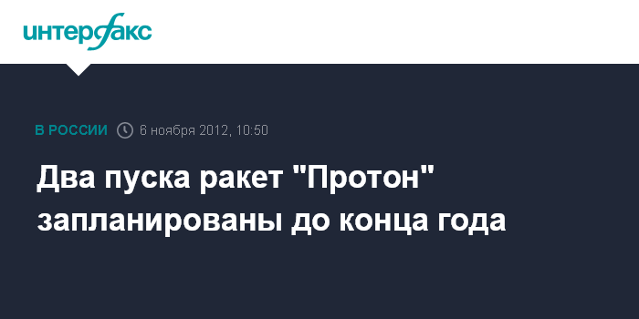 Москва. 6 ноября. INTERFAX.RU - Космический центр им.Хруничева готовится осуществить в ноябре-декабре два космических пуска с помощью ракет-носителей "Протон-М", говорится в сообщении, опубликованном на сайте предприятия.
