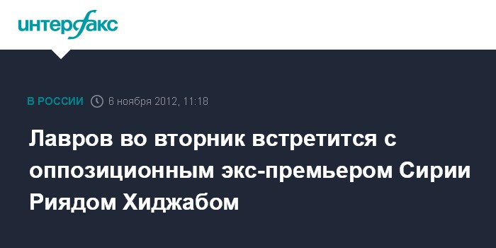Амман. 6 ноября. INTERFAX.RU - Глава МИД РФ Сергей Лавров во вторник в Аммане проведет встречу с бывшим премьером Сирии Риадом Хиджабом, перешедшим в оппозицию, заявил журналистам замглавы МИД РФ Михаил Богданов.