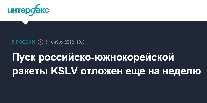 Москва. 6 ноября. INTERFAX.RU - Запуск южнокорейской ракеты-носителя KSLV-1, перенесенный по техническим причинам из-за проблем с первой ступенью российского производства, отложен еще минимум на неделю.