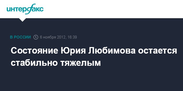 Москва. 6 ноября. INTERFAX.RU - Состояние известного режиссера Юрия Любимова, который проходит лечение в 23 больнице Москвы, оценивается как стабильно тяжелое с некоторой положительной динамикой.