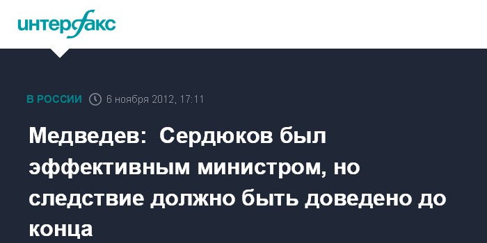 Ханой. 6 октября. INTERFAX.RU - Премьер-министр РФ Дмитрий Медведев назвал отправленного в отставку главу Минобороны Анатолия Сердюкова эффективным министром, поставил ему в заслугу успешную операцию по приведению Грузии к миру, но наряду с этим выразил мнение, что расследование в афилированных с министерством структурах должно быть доведено до конца.