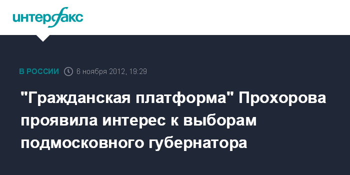 Москва. 6 ноября. INTERFAX.RU - Партия бизнесмена Михаила Прохорова "Гражданская платформа" планирует принять участие в выборах подмосковного губернатора в будущем году. "Московская область является одним из приоритетных регионов для партии "Гражданская платформа". Поэтому наша партия, безусловно, примет самое активное участие в выборах губернатора Подмосковья в сентябре 2013 года", - написал лидер партии Прохоров во вторник в своем блоге в "Живом Журнале".