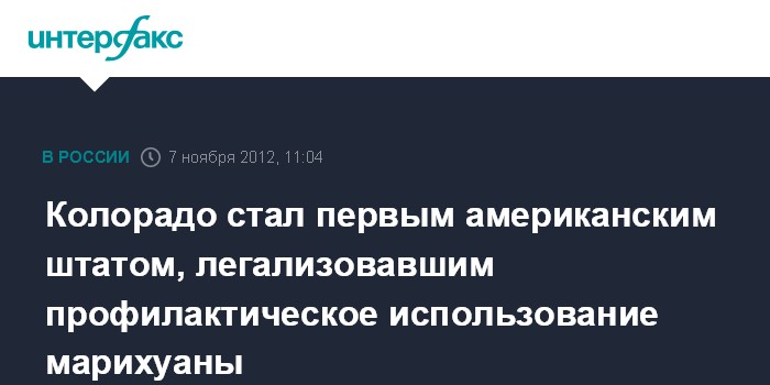 Вашингтон. 7 ноября. INTERFAX.RU - Американский штат Колорадо стал первым штатом, легализовавшим использование марихуаны в профилактических целях, сообщила в среду американская газета Denver Post.