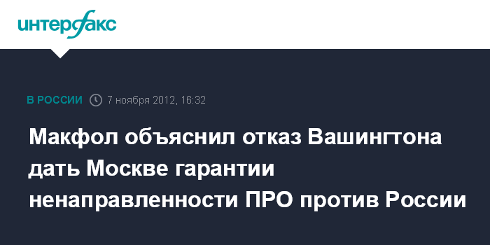 "Потому что мы не знаем, как угроза в Иране будет развиваться. Это не имеет отношения к России. Мы не можем сдерживать свои военные силы против угрозы", - сказал Макфол в среду в интервью "Интерфаксу", отвечая на вопрос, почему Вашингтон не может дать письменных гарантий для снятия озабоченностей России.