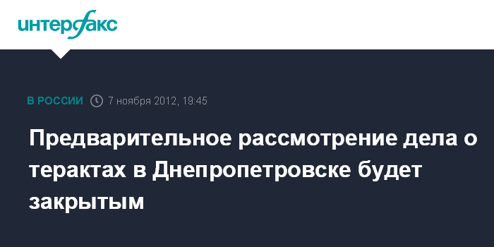 Днепропетровск. 7 ноября. INTERFAX.RU - Предварительное рассмотрение дела о терактах в Днепропетровске в Индустриальном районном суде в четверг будет проходить в закрытом режиме.