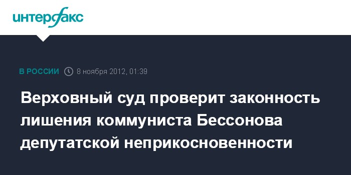 Москва. 8 ноября. ИНТЕРФАКС - Верховный суд РФ в четверг рассмотрит заявление депутата Государственной думы от фракции КПРФ Владимира Бессонова об отмене постановления палаты, которым он был лишен депутатской неприкосновенности.