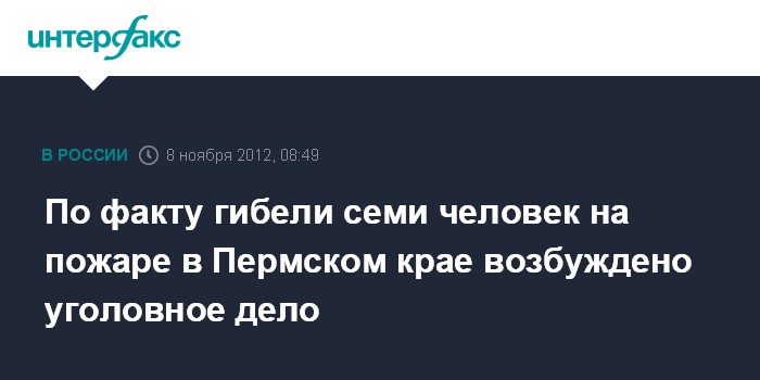 Пермь. 8 ноября. INTERFAX.RU - Следователи возбудили уголовное дело о причинении смерти по неосторожности двум и более лицам по факту гибели семи человек в результате пожара в поселке Сарс.