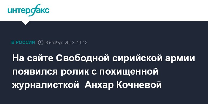 Дубай. 8 ноября. INTERFAX.RU - Видеоролик, на котором запечатлена пропавшая в Сирии украинская журналистка Анхар Кочнева, появился на канале Youtube, принадлежащем сирийским вооруженным оппозиционерам.