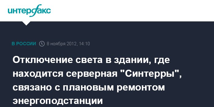 Отключение света в здании, где находится серверная "Синтерры", связано с плановым ремонтом энергоподстанции