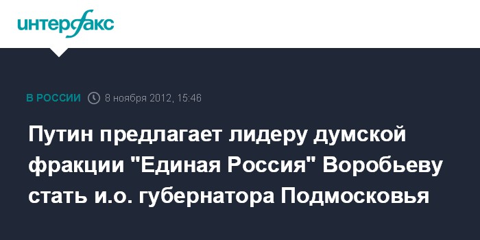 Москва. 8 ноября. INTERFAX.RU - Президент России Владимир Путин предложил лидеру фракции "Единая Россия" в Госдуме Андрею Воробьеву занять пост исполняющего обязанности губернатора Московской области.