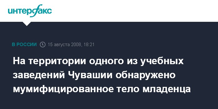 Москва. 15 августа. INTERFAX.RU - В ветхом сарайчике одного из учебных заведений Алатыря (Чувашия) в коробке от компьютера обнаружено высохшее тело младенца, пролежавшее там несколько лет.