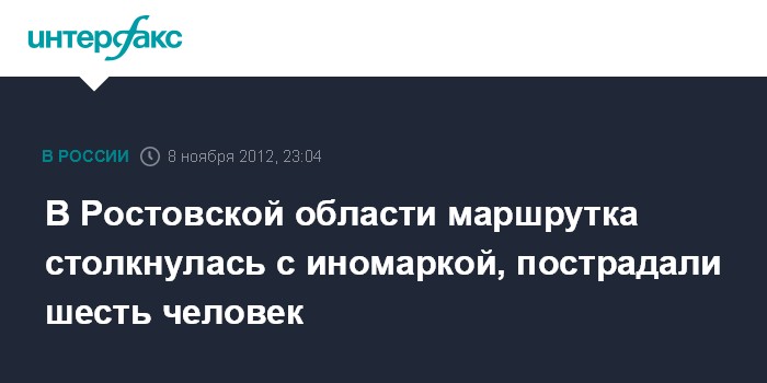Ростов-на-Дону. 8 ноября. INTERFAX.RU - Дорожно-транспортное происшествие с участием иномарки и маршрутного такси произошло в г. Батайске Ростовской области, пострадали шесть человек, сообщили агентству "Интерфакс-Юг" в экстренных службах региона в четверг.