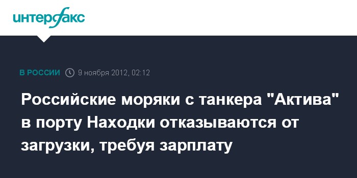 Владивосток. 9 ноября. ИНТЕРФАКС-ДАЛЬНИЙ ВОСТОК - Экипаж танкера "Актива" (судовладелец - "Восточная судоходная компания) в порту приморского города Находка объявил акцию протеста из-за долгов по заработной плате - моряки отказываются загружать судно.