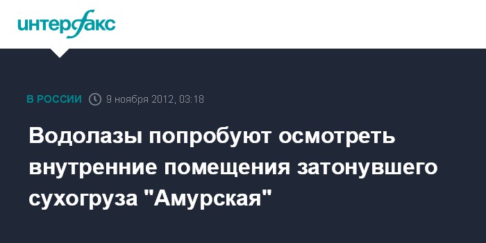 Южно-Сахалинск. 9 ноября. ИНТЕРФАКС-ДАЛЬНИЙ ВОСТОК - Водолазы "Рубина" СахБАСУ и МЧС попытаются сегодня совершить погружение к затонувшему сухогрузу "Амурская" для осмотра внутренних помещений корабля, сообщили агентству "Интерфакс-Дальний Восток" в морском спасательном подцентре МСПЦ "Южно-Сахалинск".