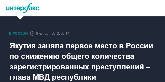 "По целому ряду критериев мы вышли на лидирующие позиции среди регионов России. По темпам снижения числа нераскрытых преступлений Якутия занимает пятое место в России. Также в 2012 году прокуратурой выявлено на 16% меньше нарушений учетно-регистрационной дисциплины", - цитируются в сообщении слова В.Кошелева.