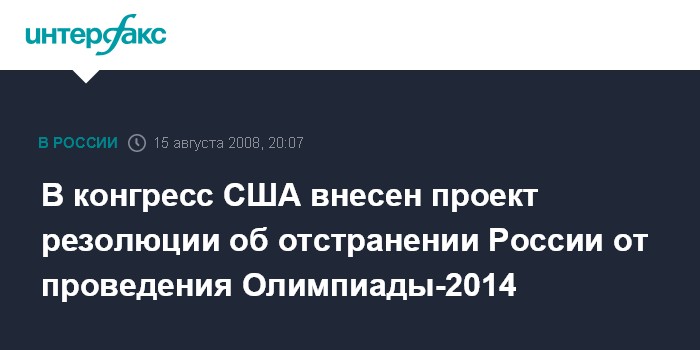 Вашингтон. 15 августа. ИНТЕРФАКС - Конгресс США в сентябре может рассмотреть проект резолюции с призывом к Международному олимпийскому комитету (МОК) отменить проведение зимних Олимпийских игр в Сочи в 2014 году из-за военных действий Москвы в Грузии и перенести их в другую страну.