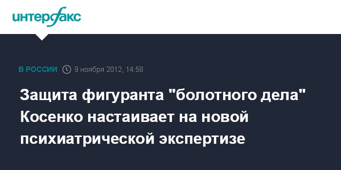 Москва. 9 ноября. INTERFAX.RU - Адвокаты обвиняемого по делу о массовых беспорядках на Болотной площади в столице Михаила Косенко просят суд назначить ему повторную психиатрическую экспертизу.