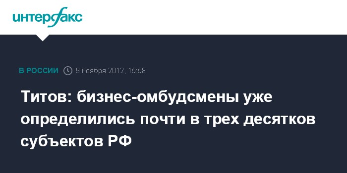 Москва. 9 ноября. INTERFAX.RU - В 28 российских регионах уже определены кандидатуры бизнес-омбудсменов, сообщил уполномоченный при президенте РФ по защите прав предпринимателей Борис Титов.
