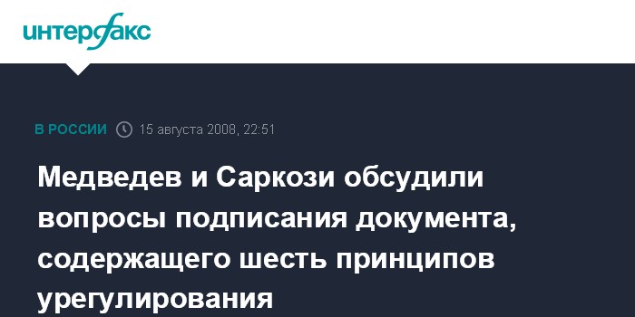 "Главы государств обсудили вопросы завершения процедуры подписания всеми заинтересованными сторонами документа, содержащего совместно сформулированные Д.Медведевым и Н.Саркози в Москве шесть принципов урегулирования конфликтов", - сообщила пресс-служба Кремля.
