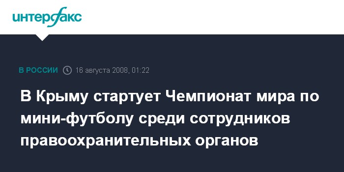 Симферополь. 16 августа. ИНТЕРФАКС-УКРАИНА - В Крыму с 16 по 22 августа под эгидой Международной спортивной полицейской Ассоциации WISPA пройдет IX Чемпионат мира по мини-футболу среди полицейских.