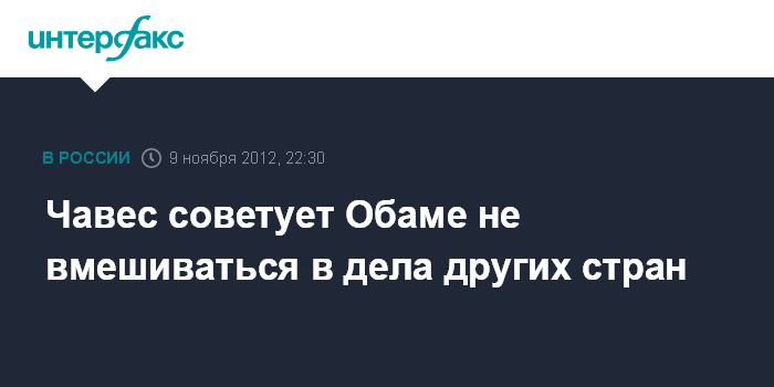 Каракас. 9 ноября. ИНТЕРФАКС - Президент Венесуэлы Уго Чавес посоветовал своему американскому коллеге Бараку Обаме, добившемуся переизбрания, меньше вмешиваться во внутренние дела других стран и уделять больше внимания проблемам собственных сограждан.