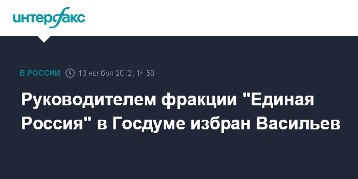 Москва. 10 ноября. INTERFAX.RU - Новым руководителем фракции "Единая Россия" стал член комитета Госдумы по безопасности и противодействию коррупции Владимир Васильев.