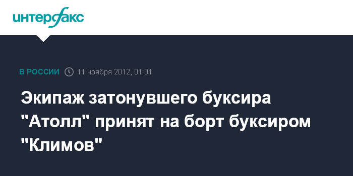Ростов-на-Дону. 11 ноября. ИНТЕРФАКС-ЮГ - Буксир "Климов", подошедший к месту, где затонуло судно "Атолл", эвакуировал на борт его экипаж в составе трех человек, сообщили агентству "Интерфакс - Юг" в пресс-службе Южного регионального центра МЧС России.