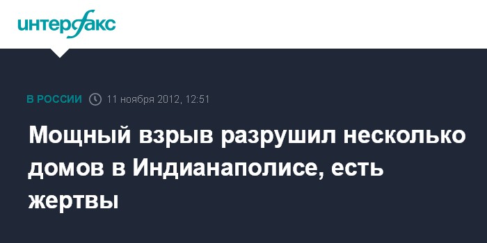 Вашингтон. 11 ноября. INTERFAX.RU - По меньшей мере, один человек погиб в результате мощного взрыва в городе Индианаполис в центральной части США, сообщает в воскресенье "Ассошиэйтед пресс".