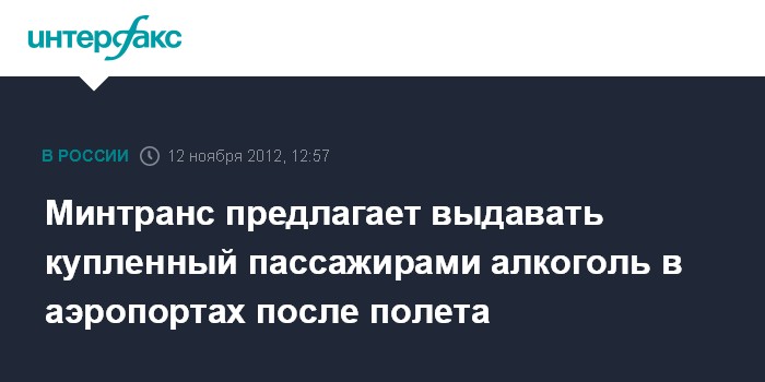 Москва. 12 ноября. INTERFAX.RU - Министерство транспорта РФ предлагает выдавать пассажирам алкоголь, приобретенный в магазинах аэропортов, по прилету в пункт назначения. "В целях исключения случаев распития пассажирами на борту воздушного судна спиртных напитков в неограниченных количествах и с учетом рекомендаций ИКАО, содержащихся в руководстве по авиационной безопасности, проектом федерального закона предусматривается, что выдача пассажирам спиртных напитков, приобретенных в магазинах розничной торговли в контролируемой зоне аэропорта или на борту воздушного судна, может осуществляться по окончании полета в порядке определенном федеральными авиационными правилами", - говорится в проекте федерального закона о внесении изменений в воздушный кодекс РФ.
