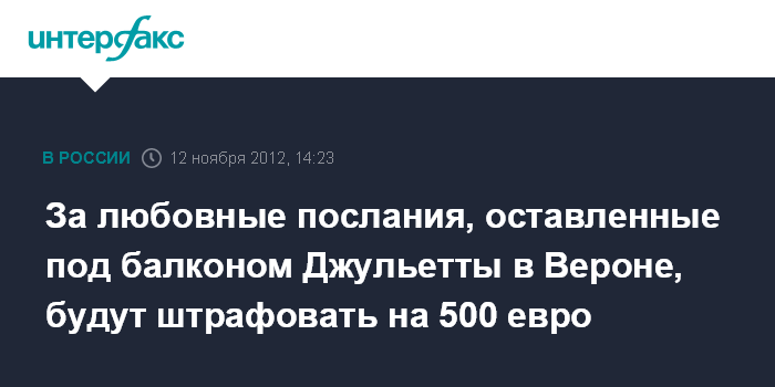 По информации издания, такое постановление сейчас разрабатывает городской совет Вероны. Штраф за размещение подобных посланий в виде записок или граффити, а также употребление пищи и распитие напитков во дворе дома Джульетты, составит 500 евро.